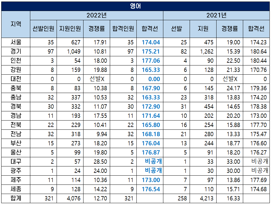 이번 포스팅에서는 전국 17개 지역의 중등임용고시 일반 모집 최종 합격선을 과목별로 비교 분석했는데요. 2022년 지역별 중등임용고시 최종 합격자 현황 및 커트라인은 하단에 링크를 첨부한 포스팅을 보시기 바랍니다.