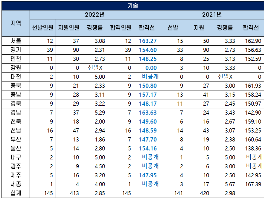 2022년도 중등임용고시 기술 과목 최종 합격선이 가장 큰 폭으로 하락한 지역은 부산시로 2022년 가장 낮은 커트라인 147.70점을 기록하며 지난해보다 합격선이 12.94점 하락했습니다.
