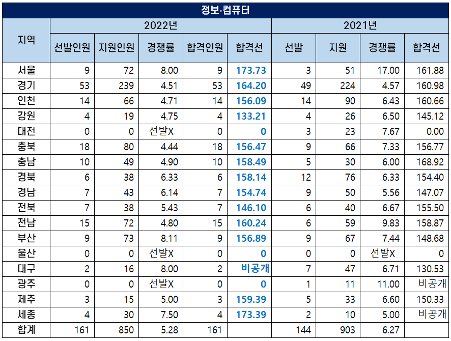 2022년도 중등임용고시 정보·컴퓨터 과목 최종 합격선이 가장 큰 폭으로 상승한 지역은 2022년 가장 높은 합격선을 보인 서울시로 커트라인 173.73점을 기록하며 지난해보다 합격선이 11.85점 상승했습니다.