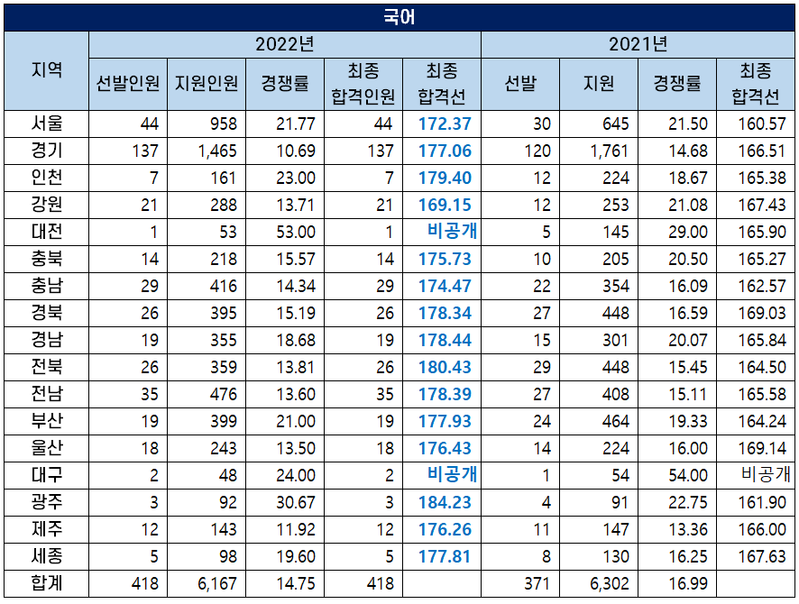 2022년도 중등임용고시 국어 과목 1차 시험 점수와 2차 시험 점수를 합한 최종 합격선은 2021년보다 크게 상승했는데요. 가장 높은 커트라인을 기록한 전라북도의 합격선은 180.43점으로 지난해보다 커트라인이 15.93점 상승했습니다.