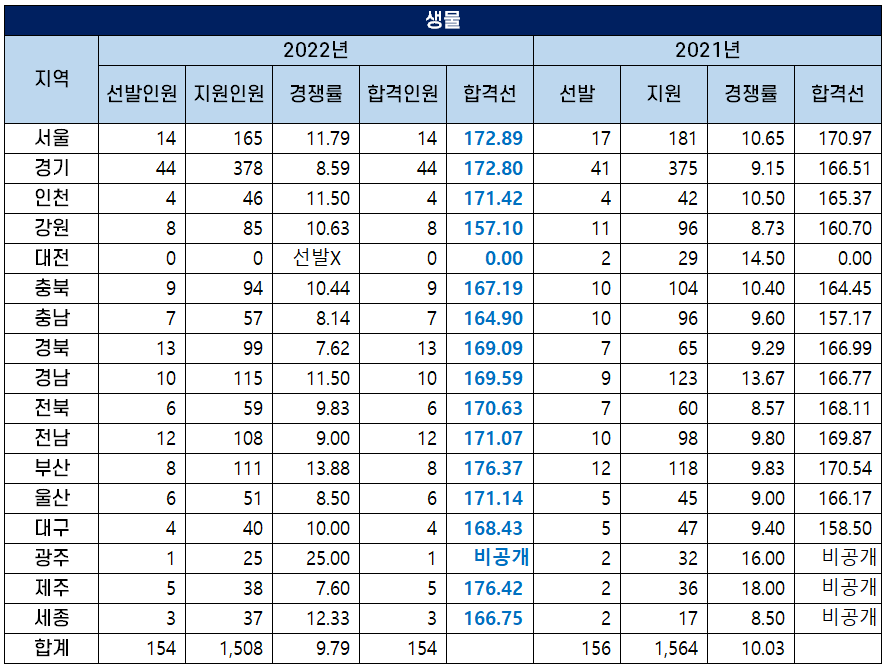 2022 중등임용고시 생물 커트라인