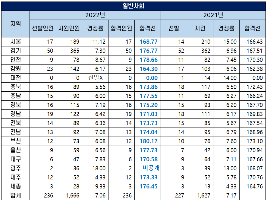 2022년도 중등임용고시 일반사회 과목 최종 합격선은 2021년보다 상승했는데요. 가장 큰 폭으로 합격선이 상승하며 가장 높은 합격선을 보인 세종시의 커트라인은 176.45점으로 지난해보다 합격선이 1169점 상승했습니다.