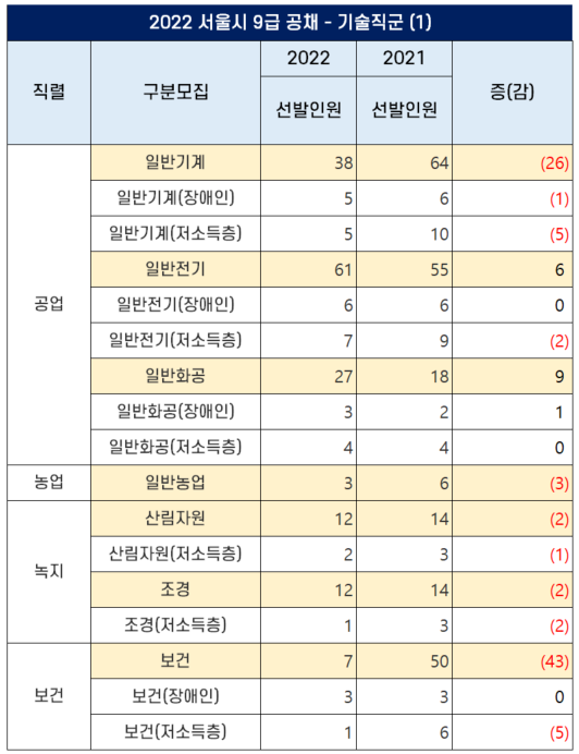 2022년 서울시 9급 공무원 기술직의 직렬 및 구분 모집 단위별 선발예정인원은 아래 표와 같은데요. 공업(일반화공) 직렬을 제외한 모든 직렬의 선발예정인원이 지난해보다 감소했습니다.