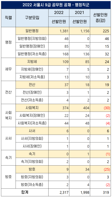 9급 공무원 공채 선발예정인원 2,776명 중 행정직이 2,317명인데요. 지난 2021년 1,998명을 선발했던 것에 비해면 2022년 티오가 319명이 늘었습니다. 참고로 2021년 행정직 평균 경쟁률이 12대 1이었는데 2022년은 선발인원 증가로 경쟁률이 하락하지 않을까 합니다.