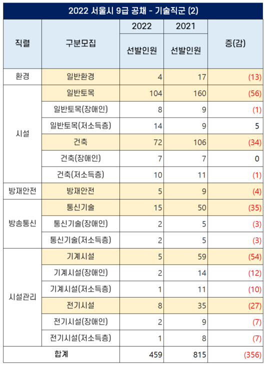 반면, 2022년 기술직 9급 공무원 선발인원은 크게 감소했는데요. 2021년 815명을 선발했었으나 2022년에는 356명이 감소한 459명을 선발할 예정입니다. 지난해 기술직 평균 경쟁률은 7.2대 1이었는데요. 선발인원의 급감으로 인해 2022년에는 경쟁률이 큰 폭으로 상승할 듯합니다.