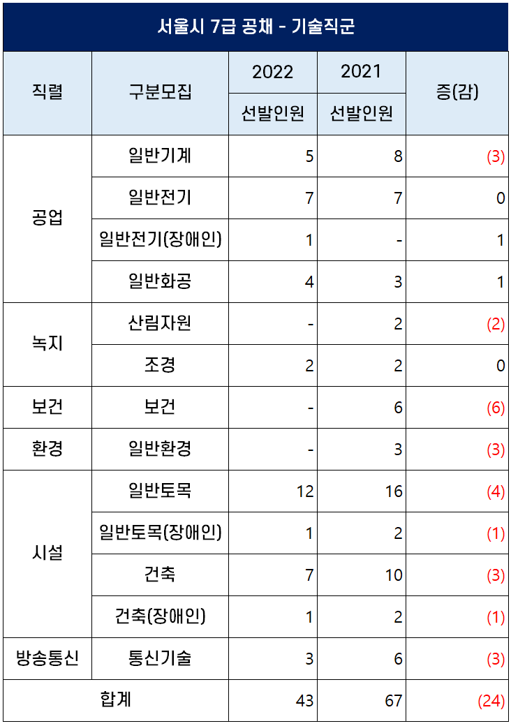 2022년 기술직 7급 공무원 선발인원도 크게 감소했는데요. 2021년 67명을 선발했었으나 2022년에는 24명이 감소한 43명을 선발할 예정입니다. 지난해 기술직 평균 경쟁률은 42.9대 1이었는데요. 선발인원의 급감으로 인해 2022년에는 경쟁률이 큰 폭으로 상승할 듯합니다.