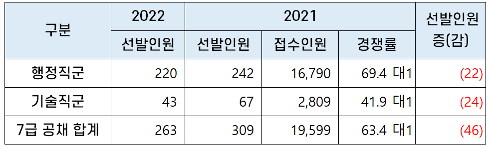 7급 공무원 공채 선발예정인원 263명 중 행정직이 220명인데요. 지난 2021년 242명을 선발했던 것에 비해면 2022년 티오가 22명 줄었습니다. 참고로 2021년 행정직 평균 경쟁률이 69.4대 1이었는데 2022년은 선발인원 감소로 경쟁이 더 치열해질 것으로 보입니다.