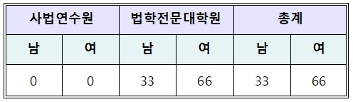 2022년 신임 재판연구원 임용 시험 최종 합격자는 99명인데요. 이중 98명은 2022년에 법학전문대학원을 졸업하는 제11기 로스쿨 학생으로 2022년 5월 1일 임용되었고, 나머지 1명은 법학전문대학원을 졸업한 법무관입니다.