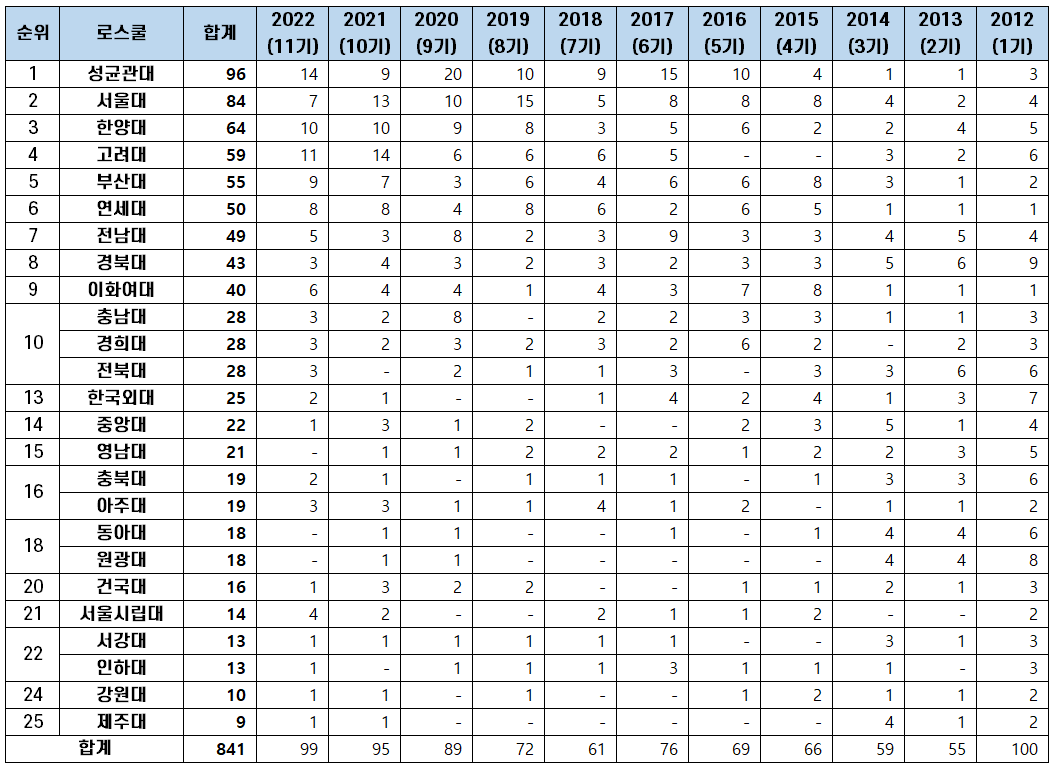 로스쿨 1기 졸업생이 재판연구원에 임용되기 시작한 2012년부터 2022년까지 11년간 법학전문대학원 별 누적 합격자 수를 아래 표로 정리했습니다(연도별 및 로스쿨별 로클럭 합격자 수는 아래 그림을 보시기 바랍니다).