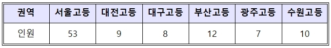 2022년 최종 선발인원인 99명은 고등법원 권역별로 재판연구원의 수요 및 결원 규모 등을 고려하여 결정되었는데요. 서울고등법원에서 53명, 대전고등법원에서 9명, 대구 고등법원 8명, 부산고등법원에서 12명, 광주고등법원 7명, 수원고등법원에서 10명을 각 선발했습니다.