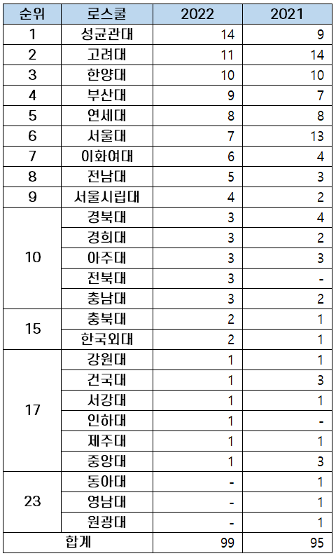 지난해 가장 많은 로클럭을 배출했던 고려대 로스쿨은 올해 3명이 감소한 11명의 합격자를 배출하며 성균관대 로스쿨에 이어 2위에 올랐고, 2021년과 동일하게 10명의 재판연구원을 배출한 한양대 로스쿨이 3위입니다.