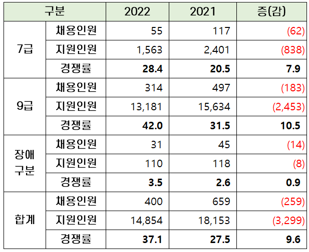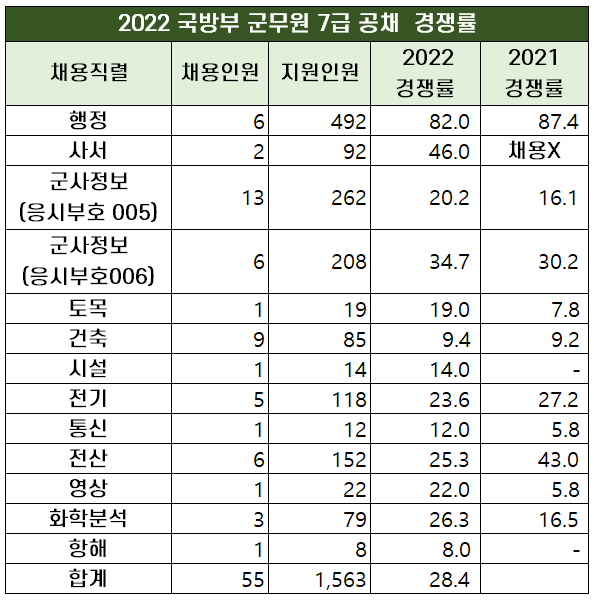 2022년 국방부 군무원 7급 공채는 채용인원의 감소로 인해 지난해 경쟁률 20.5대 1보다 상승해 올해는 28.5대 1을 기록했습니다.