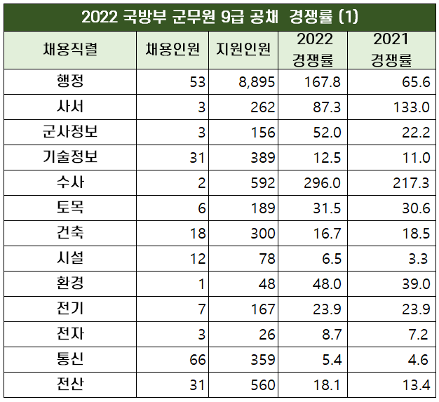 2022년 국방부 군무원은 공채 경쟁률은 37.1대 1을 기록하며 지난 2021년 경쟁률인 27.5대 1보다 상승했습니다.