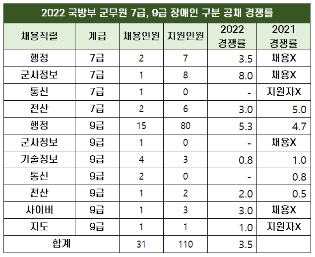 2022년 국방부 군무원 장애인 구분 모집 7급과 9급의 직렬별 경쟁률은 아래 표와 같습니다.
