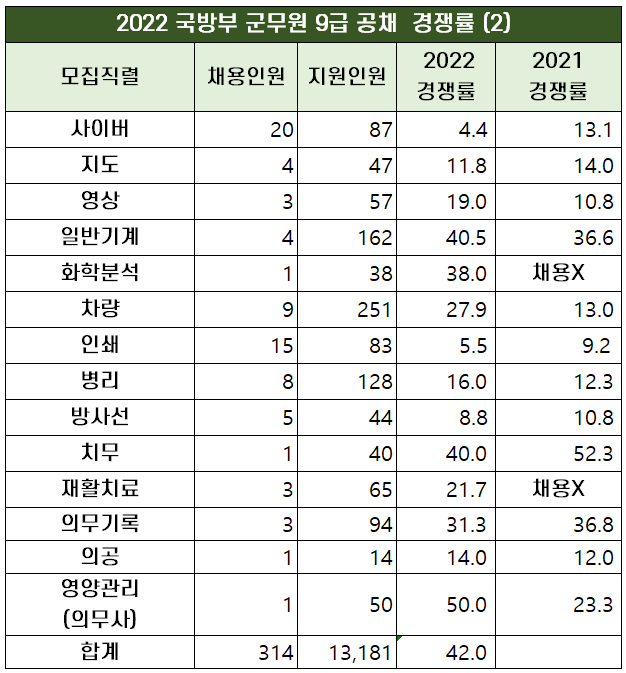 지난해 31.5대 1의 경쟁률을 기록했던 국방부 군무원 9급 공채는 올해 42대 1의 경쟁률을 보이며 전년보다 상승했는데요. 채용인원이 15,634명에서 13,181명으로 감소한데 기인합니다.
