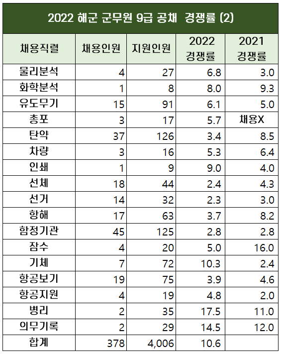 2022년 해군 군무원 경쟁률은 지난해와 비슷한 9.5대 1을 기록했습니다.