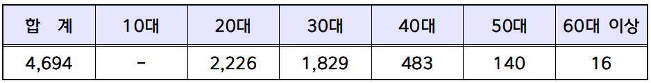 59회 세무사 1차 시험 합격자는 20대가 2,226명으로 전체 합격자의 47.4%를 차지했으며 30대가 39%, 40대가 10.3%의 비중을 차지했습니다.