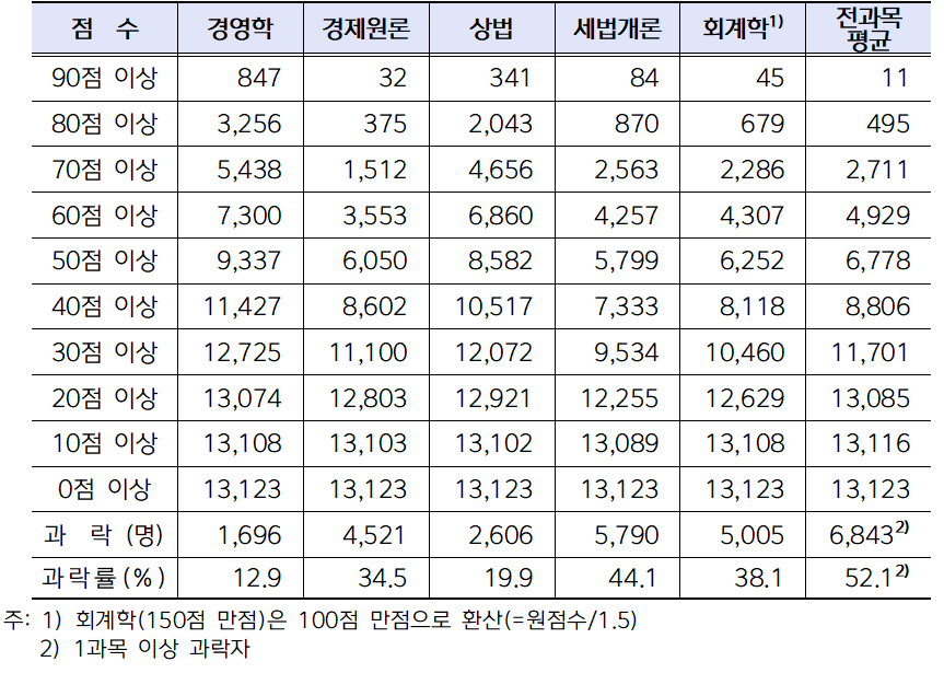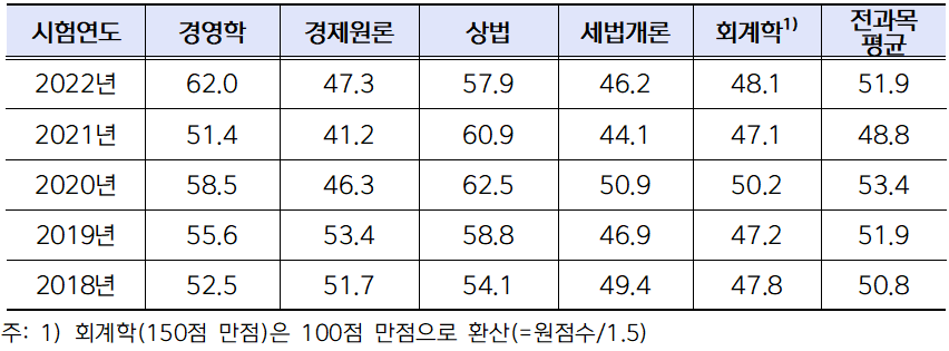 경영학, 경제원론, 세법개론, 회계학의 4과목은 지난해보다 평균 점수가 상승한 반면, 올해 수험생들이 체감 난이도가 가장 높았다고 평가한 상법만이 지난해보다 평균 점수가 하락했습니다.