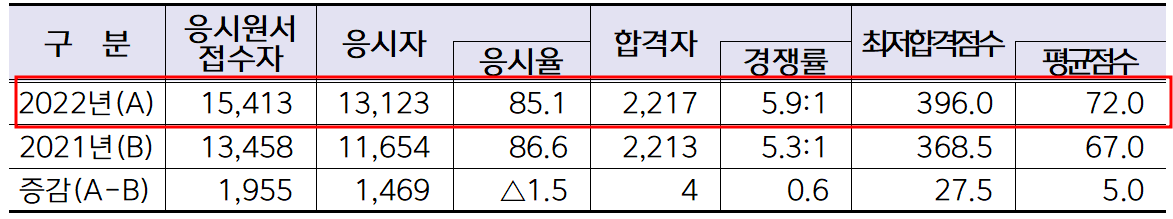 응시자의 전과목 평균 점수는 51.9점으로 지난해 48.8점보다 하락해 올해 시험이 지난해보다 난이도가 하락했음을 알 수 있습니다.