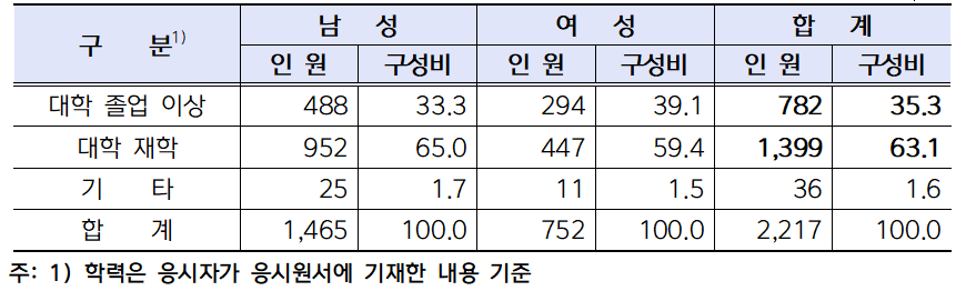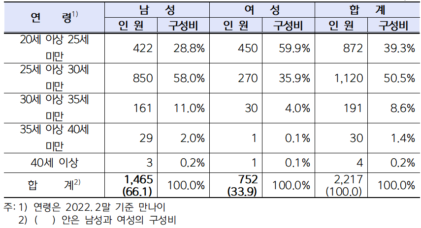 합격자는 20대 후반(25~29세)이 50.5%로 가장 많고, 20대 전반(39.3%), 30대 전반(8.6%) 등의 순이며, 남성이 66.1%, 여성이 33.9%였습니다.