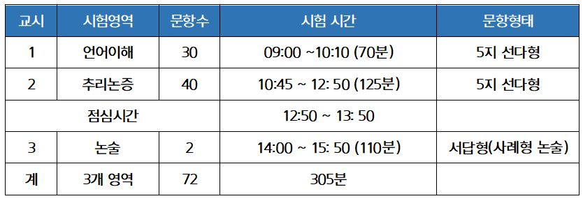 - 법학적성시험은 언어이해 영역, 추리논증 영역, 논술 영역으로 구성됨.