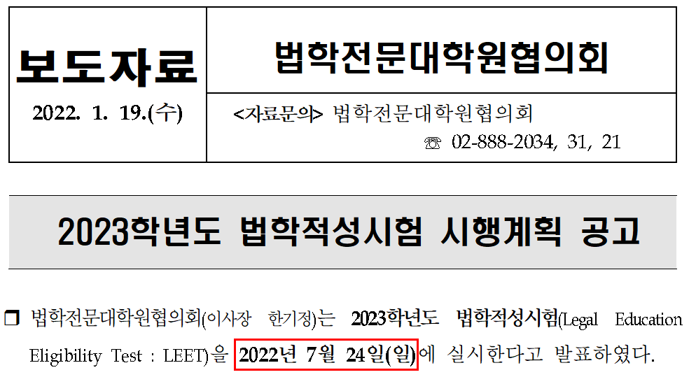 2023년 로스쿨(법학전문대학원) 입학 전형에 필요한 2023학년도 법학적성시험(LEET, 리트)을 2022년 7월 24일(일)에 시행한다고 법학전문대학원협의회가 발표했습니다.