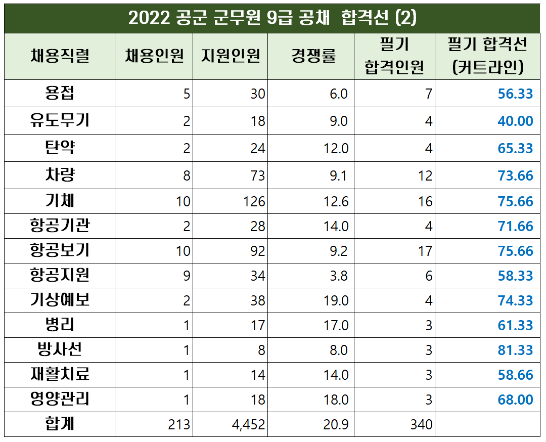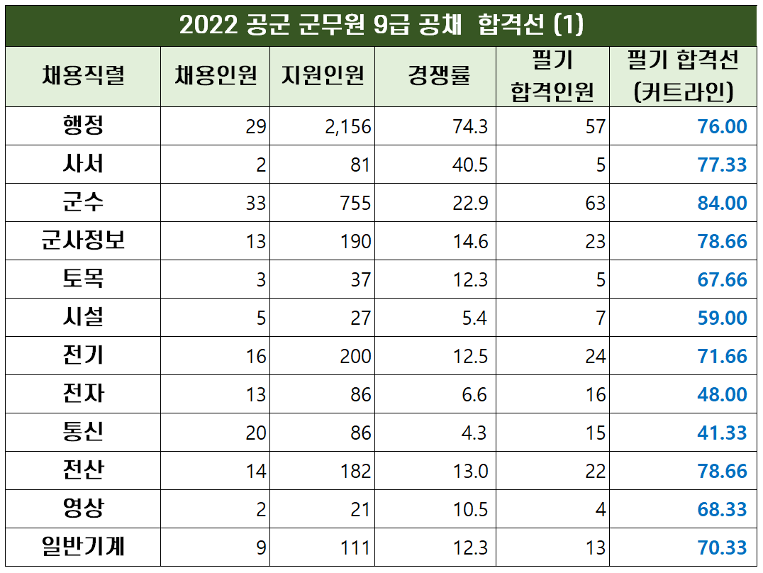 2022년 공군 군무원 9급 필기시험 합격선을 직렬별로 아래 표로 정리했습니다.