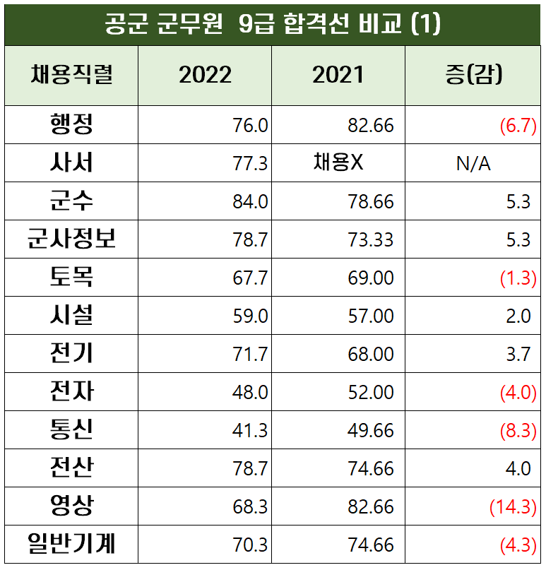 2022년과 2021년 공군 군무원 9급 합격선을 직렬별로 아래 표로 비교 했는데요.
