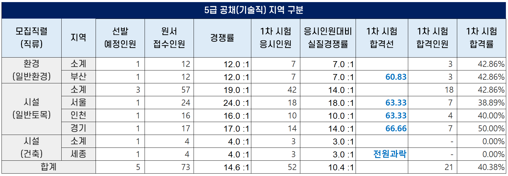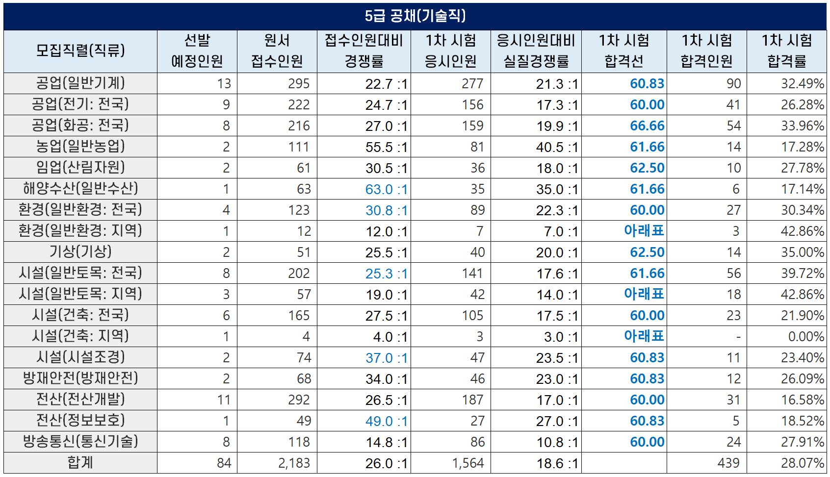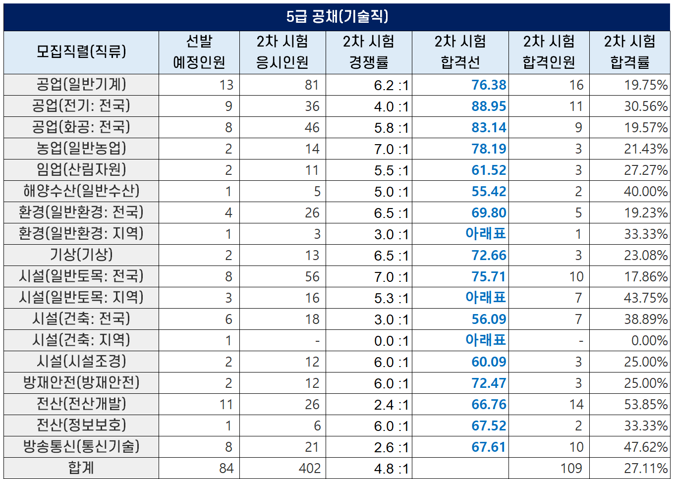 5급 공채 기술직 2차 필기시험 합격선(커트라인)