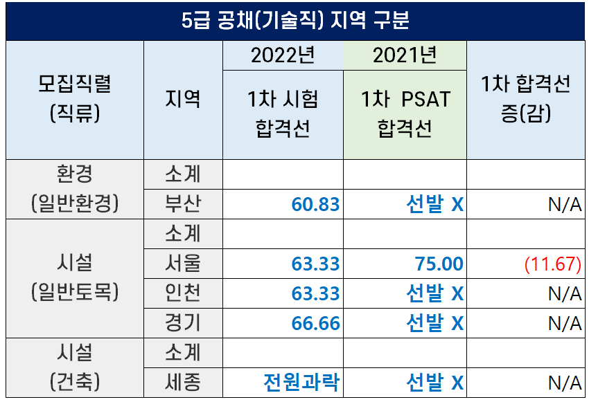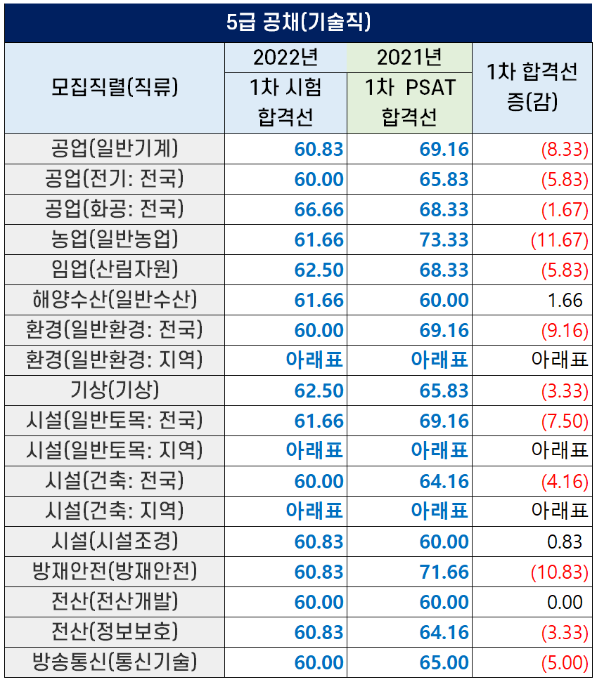 2022년과 2021년의 기술고시 1차 시험 커트라인을 비교해 아래 표로 정리했는데요. 2022년 PSAT 이 어렵게 출제되어 지난해보다 합격선이 크게 하락했습니다.