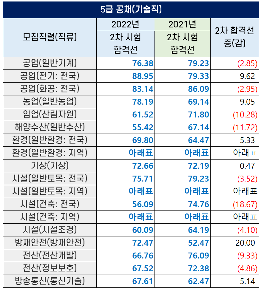 2022년과 2021년의 기술고시 2차 시험 커트라인을 비교해 아래 표로 정리했는데요. 방재안전직의 합격선이 지난해 52.47점보다 20.00점이 높아진 72.47점입니다.