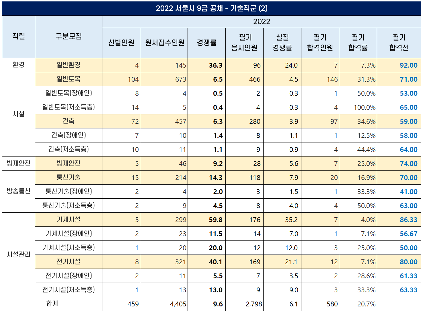 2022년 서울시 9급 기술 직군 합격선(커트라인) 과 경쟁률