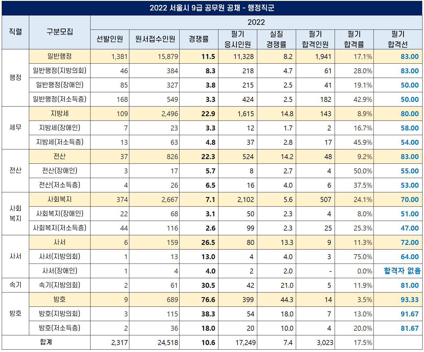 2022년 서울시 9급 행정 직군 합격선(커트라인) 과 경쟁률