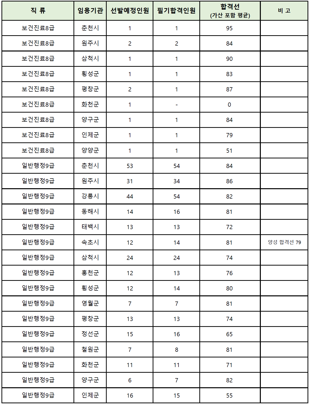 보건직 합격선은 강릉시가 92점으로 가장 높았고, 양구군이 56점으로 가장 낮았습니다.