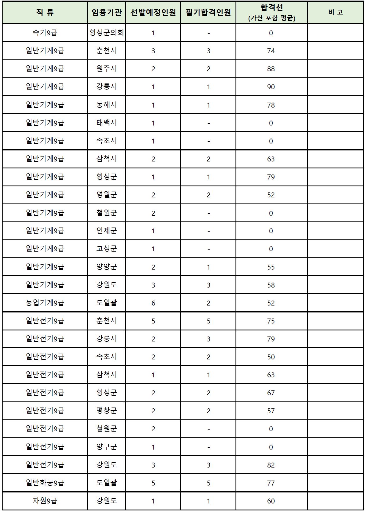 강원도 9급 일반화공직 합격선은 77점, 자원직 합격선은 60점입니다.