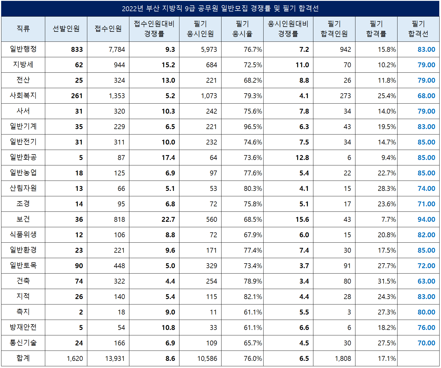 2022년 부산 지방직 9급 공무원 공채 중에서 가장 경쟁률이 높았던 보건직의 경쟁률은 22.7대 1이었고, 합격선도 94.00점으로 가장 높았습니다.
