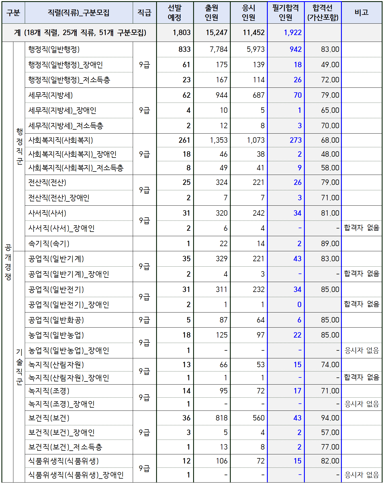 833명으로 가장 많은 인원을 선발하는 일반행정직의 경쟁률은 9.3대 1을 기록했고, 필기 합격 커트라인은 83.00점이었습니다.