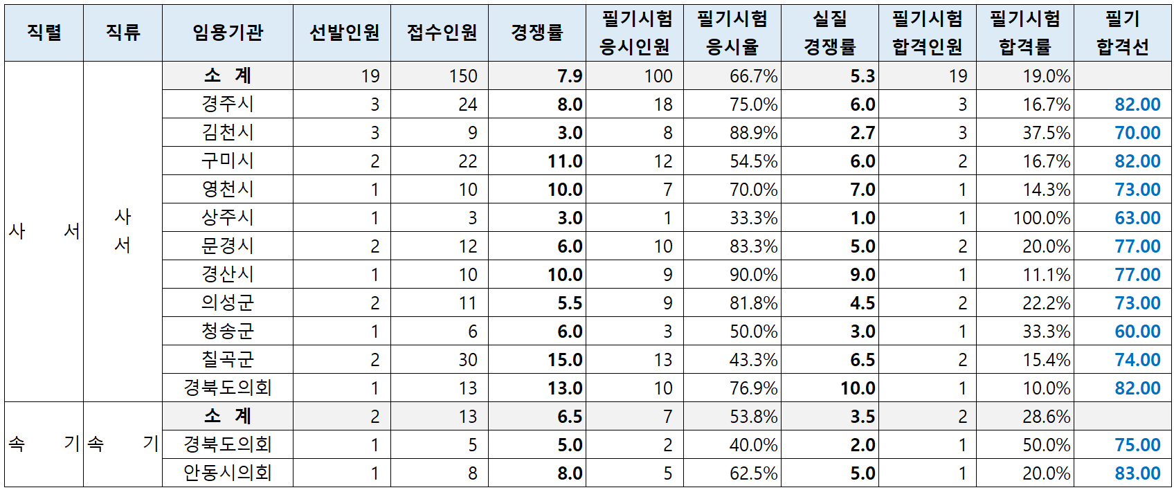 경상북도 사서직 합격선은 경주시, 구미시와 경북도의회가 82.00점으로 가장 높았고, 청송군이 60.00점으로 가장 낮았습니다.