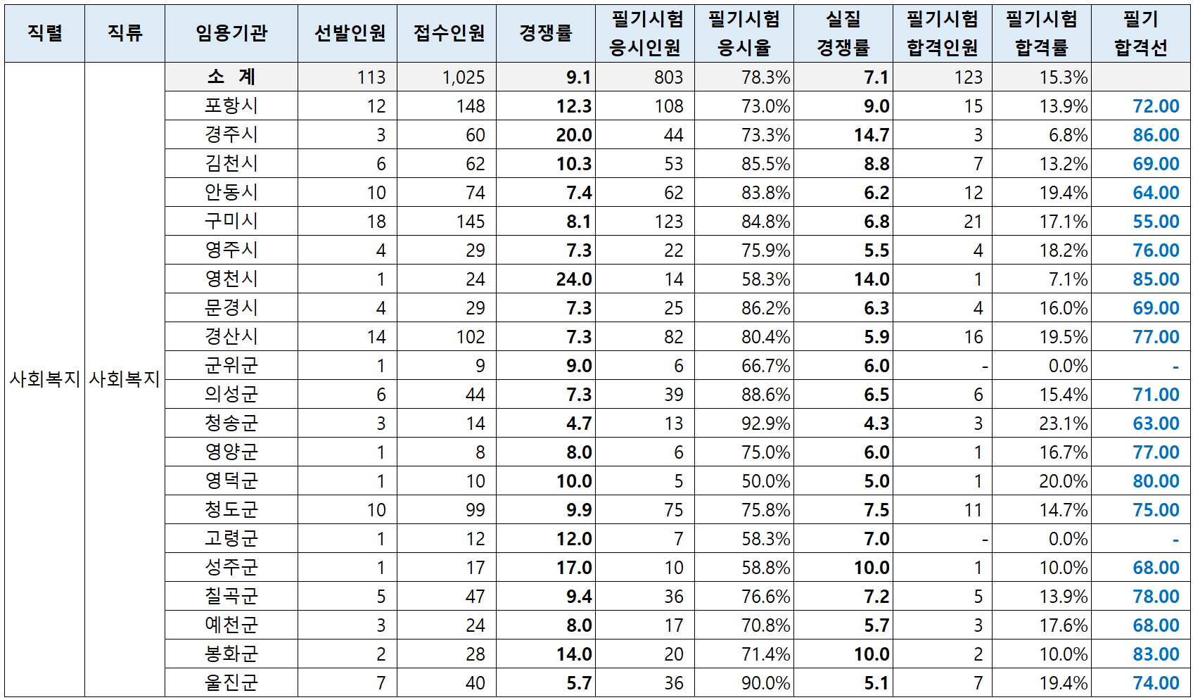 경상북도 사회복지직의 경쟁률은 영천시가 24.0대 1로 가장 높았고, 합격선도 85.00점으로 높은 편이었습니다.