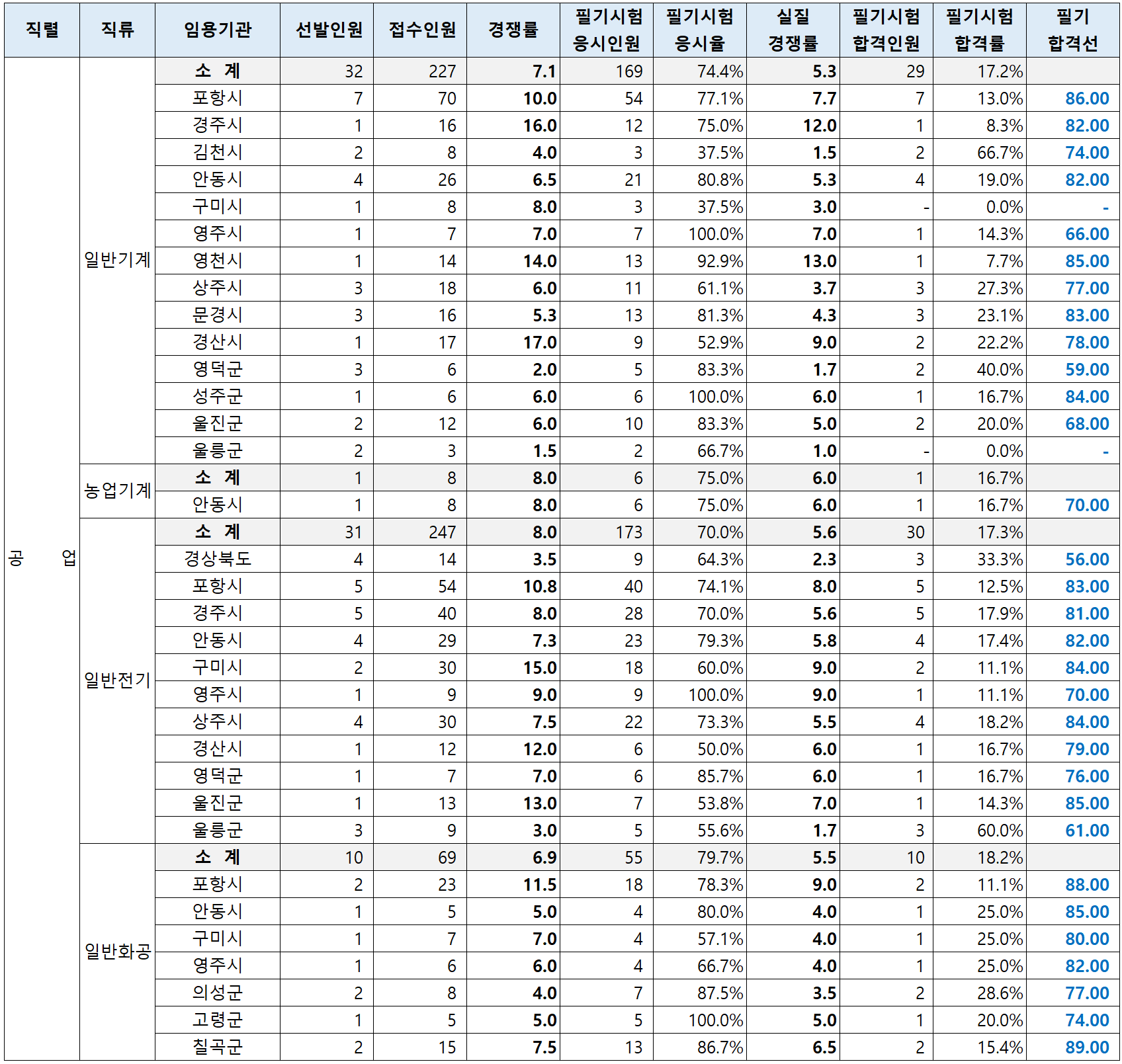 일반기계직 평균 경쟁률은 7.1대 1이었는데요. 경산시가 17.0대 1로 가장 높았고, 필기 합격선은 78.00점이었습니다.