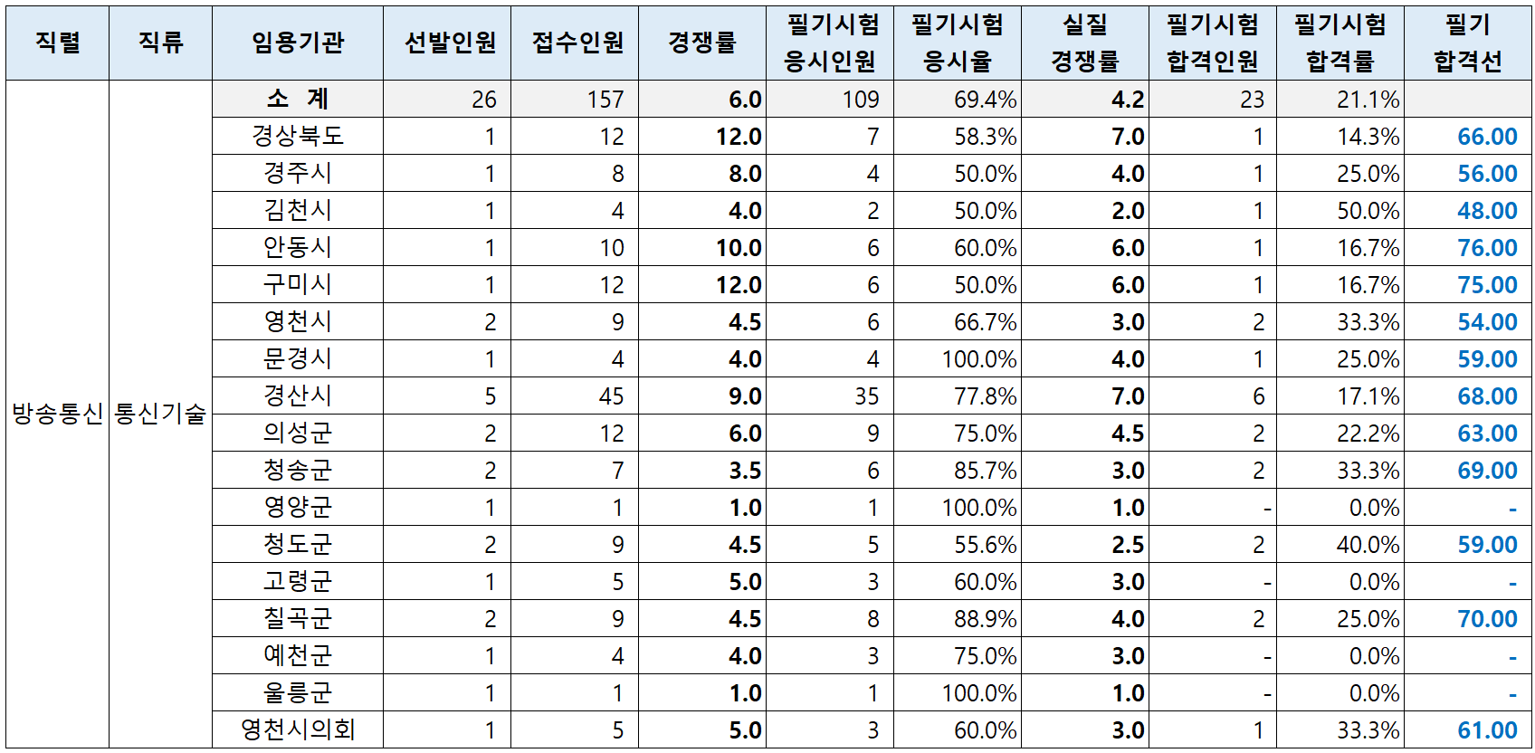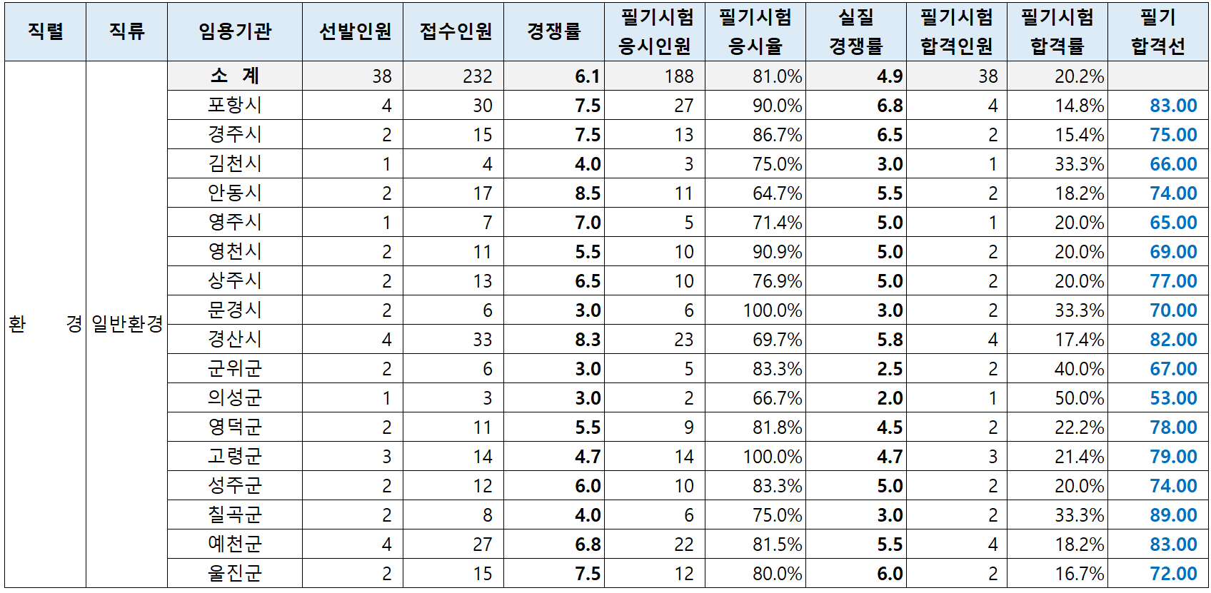 경상북도 일반환경직 평균 경쟁률은 6.1대 1이었는데요. 안동시의 경쟁률이 8.5대 1로 가장 높았고, 합격선은 74.00점이었습니다.