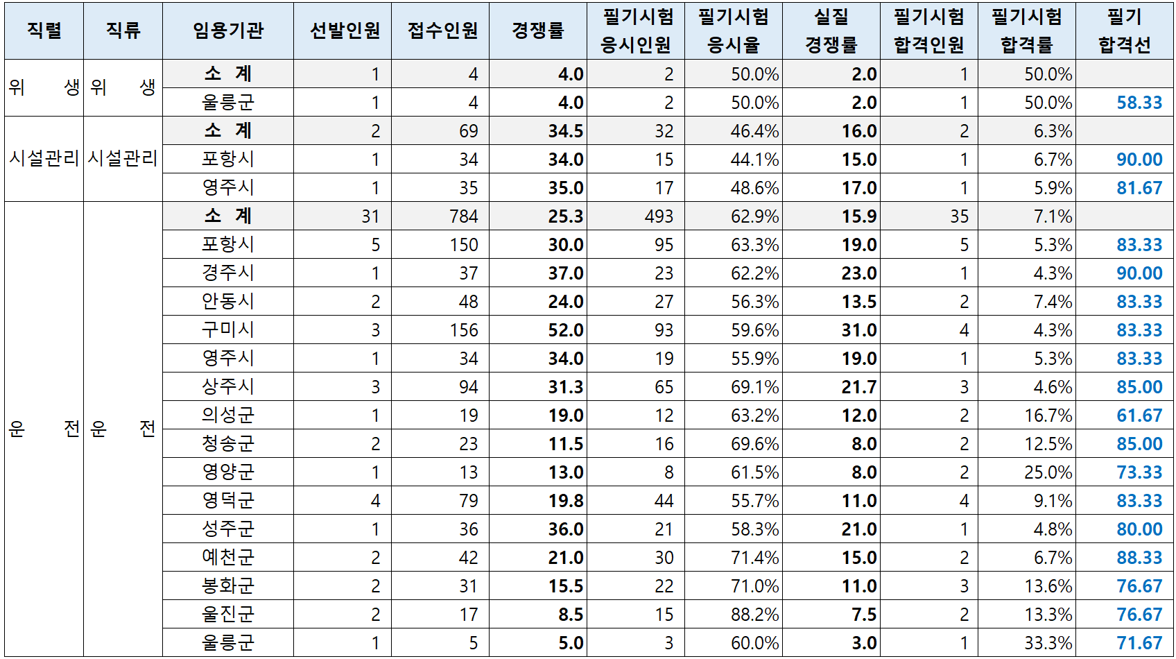 운전직은 필기 합격선은 포항시가 90.00점으로 가장 높았고, 의성군 합격선이 61.67점으로 가장 낮았습니다.