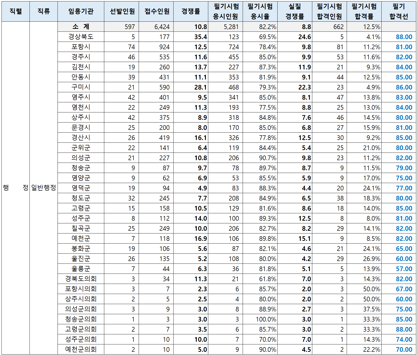 경북 지방직 공무원 일반행정직의 경쟁률을 임용기관별로 살펴보면 경상북도가 35.4대 1로 가장 높았고, 필기 합격선도 88.00점으로 고령군의회와 함께 가장 높았습니다.