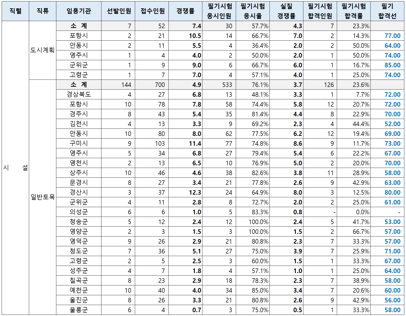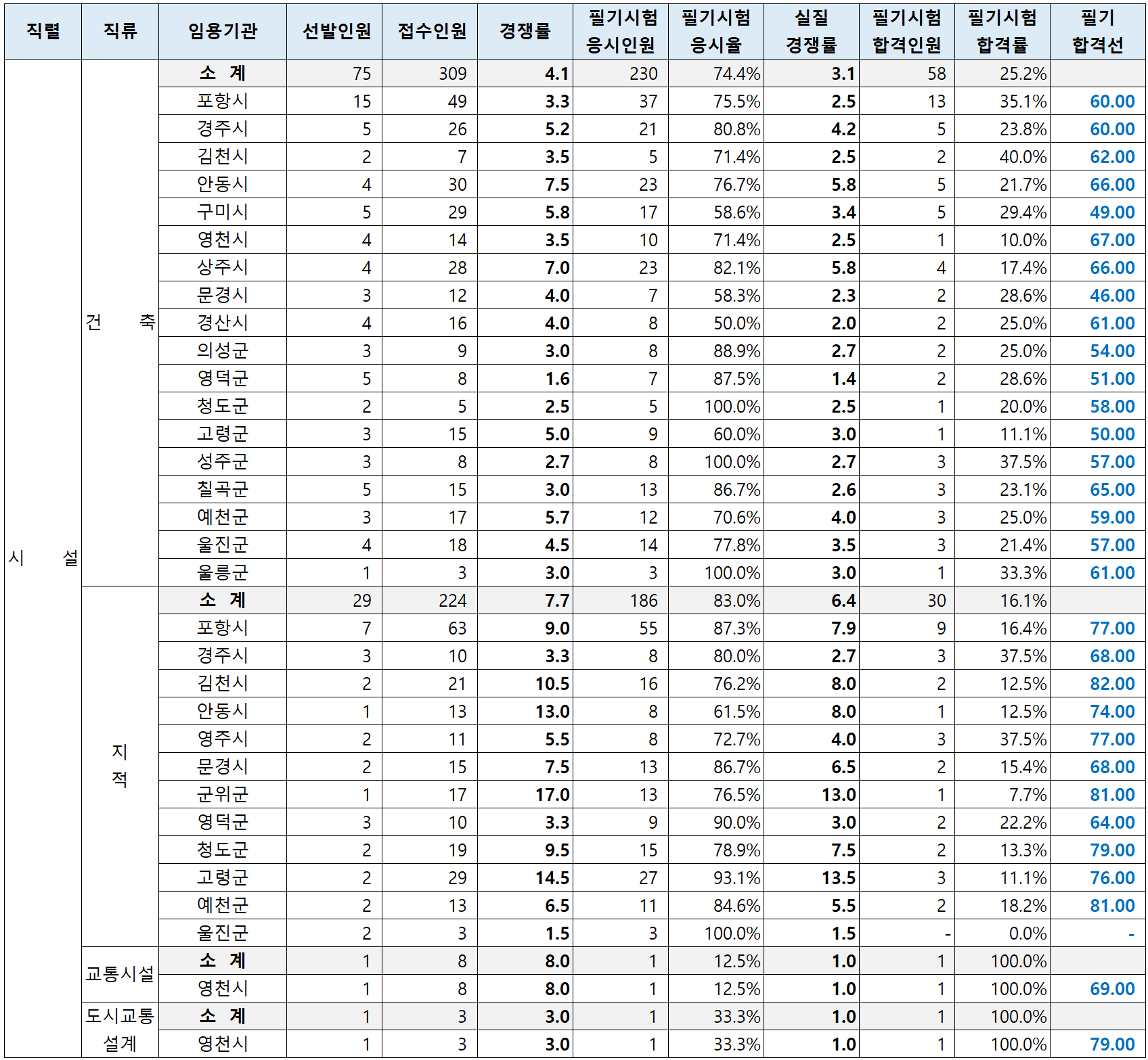 일반토목직 평균 경쟁률은 4.9대 1이었는데요. 경산시의 경쟁률이 12.3대 1로 가장 높았고, 필기 합격선도 80.00점으로 가장 높았습니다.
