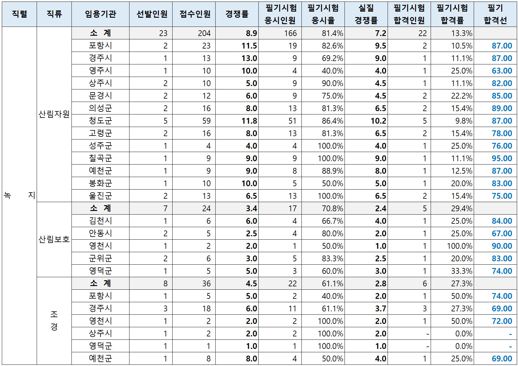 산림자원직 평균 경쟁률은 8.9대 1인데요. 경주시의 경쟁률이 13.0대 1로 가장 높았고, 필기시험 합격선도 87.00점으로 높은 편이었습니다.