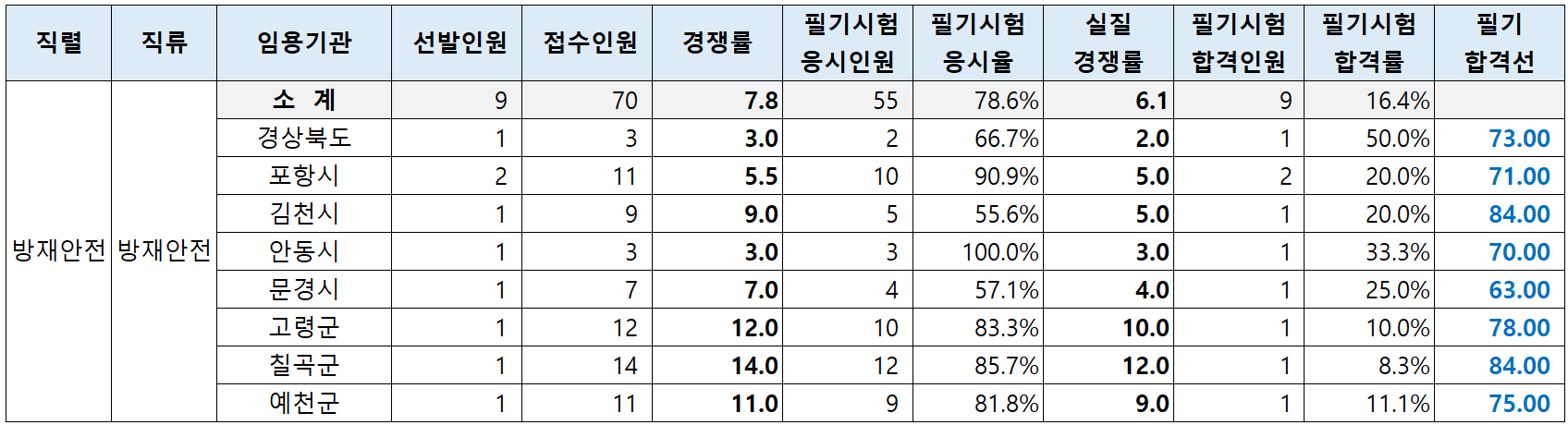 방재안전직 필기 합격선은 김천시와 칠곡군이 84.00점으로 가장 높았고, 문경시가 63.00점으로 가장 낮았습니다.