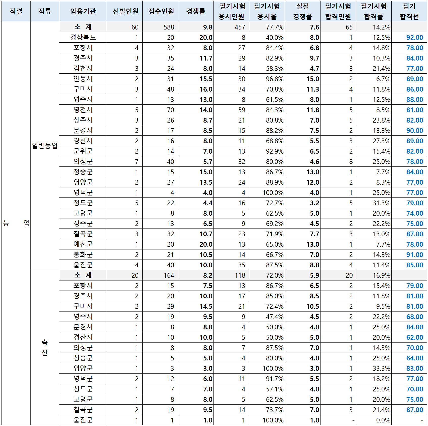 일반농업직의 평균 경쟁률은 9.8대 1인데요. 경상북도와 예천군의 경쟁률이 20.1대 1로 가장 높았습니다.