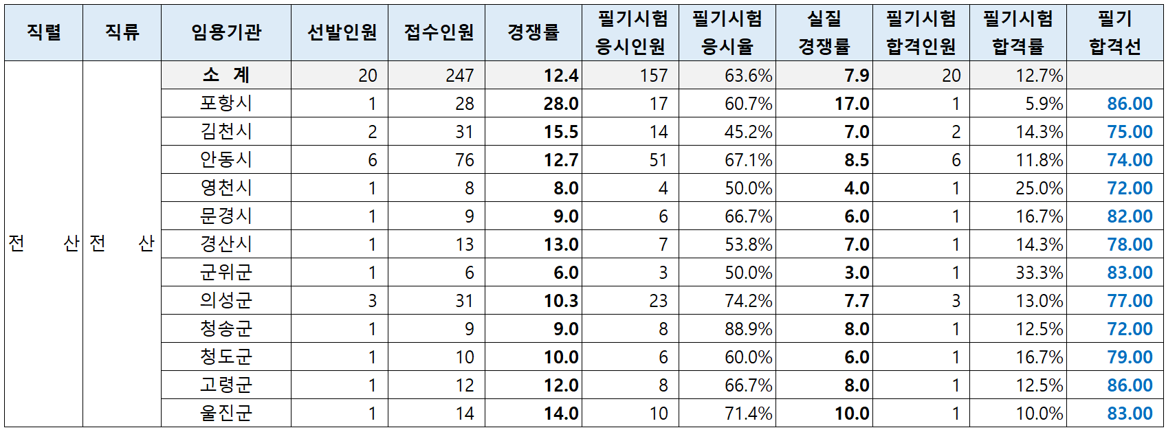 전산직 합격선은 영천시와 청송군이 72.00점으로 가장 낮았습니다.