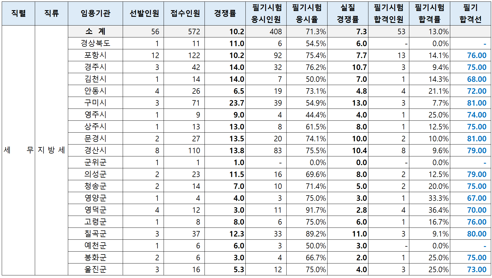 세무(지방세)직은 구미시의 경쟁률이 23.7대 1로 가장 높았고, 필기 합격선도 문경시와 함께 81.00점으로 가장 높았습니다.