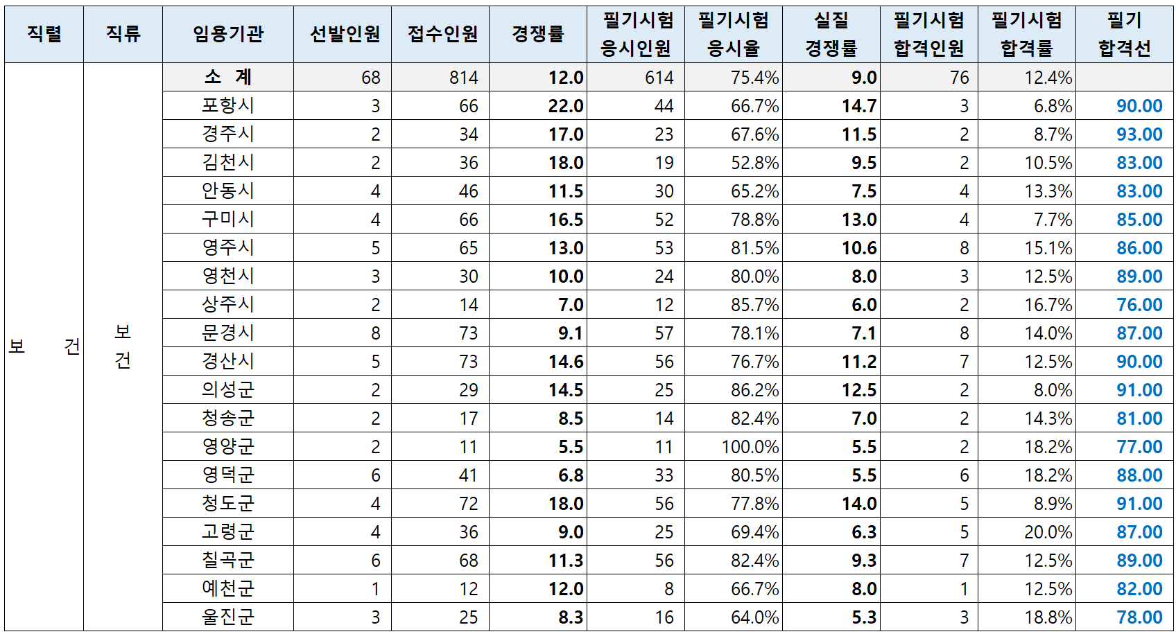 경상북도 보건직 평균 경쟁률은 12.0대 1이었는데요. 포항시의 경쟁률이 22.0대 1로 가장 높았고, 필기 합격선도 90.00점으로 높은 편이었습니다.